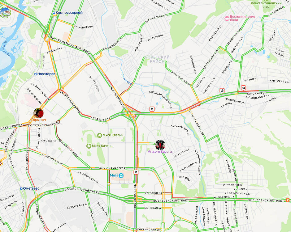 Советский район Казани сегодня утром встал в пробках. Об этом свидетельствуют данные сервиса «Яндекс.Карты».