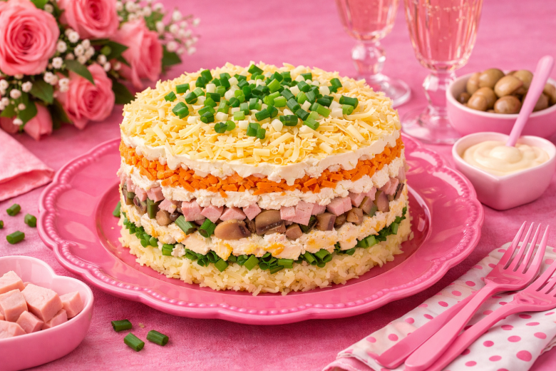 Надоели привычные салаты? Захотелось чего-то нового, нежного и по-настоящему праздничного. Этот вариант сразу покорил вкусом и внешним видом — гости просят добавку снова и снова. Салат «Шампань» получается слоеным, сочным и очень гармоничным: мягкая картошка, пикантные грибочки, нежная ветчина и сливочный сыр идеально сочетаются между собой. Он отлично подойдет и для семейного ужина, и для праздничного стола.