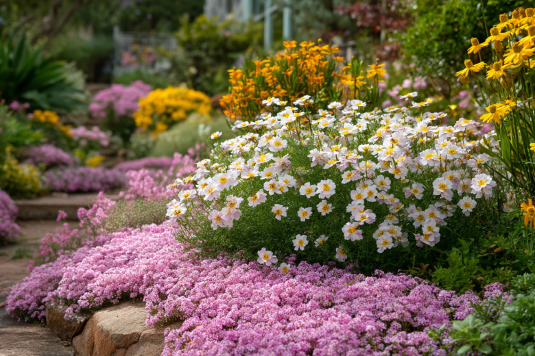 А для переднего плана идеально подойдет алиссум — его нежные медовые цветки покрывают ковром землю и не боятся перепадов температур. Все эти растения с благодарностью отзываются на минимальную заботу и радуют глаз даже в самое неудачное лето.