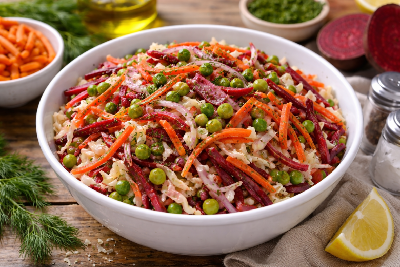 Капуста даёт хруст, свёкла — сладость, корейская морковь — пикантность, а горошек добавляет мягкости. Идеальный вариант, когда хочется чего-то лёгкого, витаминного и при этом действительно вкусного.