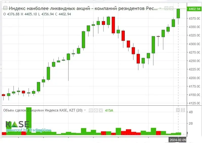 Наибольшее значение индекса KASE зафиксировано в пятницу, 9 февраля, на отметке 4 405,10 пункта. Наименьшее значение индекс показал во вторник, 6 февраля на уровне 4 282,42 пункта.