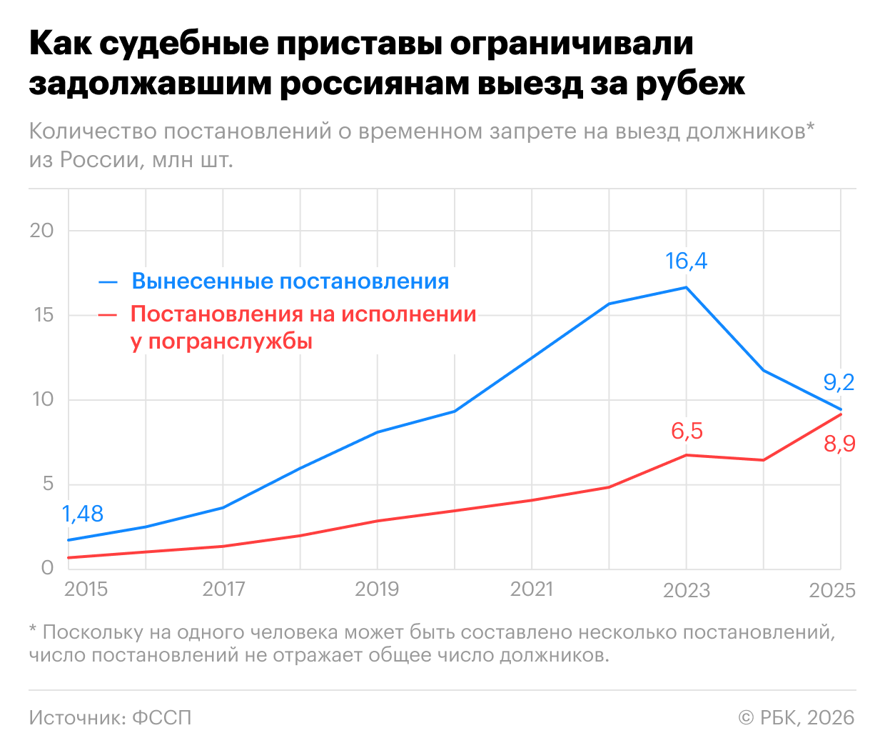 Приставы раскрывают данные о количестве дел, по которым в рамках исполнительного производства при взыскании долгов выносится решение о запрете на выезд за границу, а также о числе постановлений, которые были переданы пограничной службе. По закону на одного гражданина может быть открыто несколько исполнительных производств, по каждому из них пристав может применять разные ограничительные меры — от ареста банковских счетов и имущества до запрета покидать страну. Ранее в ФССП поясняли, что именно запреты на выезд могут вводиться в рамках каждого исполнительного производства. Таким образом, число активных постановлений на начало 2026 года (8,9 млн) не равно количеству невыездных граждан — их может быть меньше.